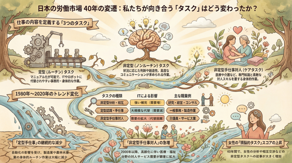 世界(特に米国)では、ICT(情報通信技術)という巨大な地殻変動が起きました。コンピューターの普及は、ルーチンワークと呼ばれる「定型業務の大陸」を海中深くへ沈め、代わりに創造や対話といった新しい島々を隆起させました。